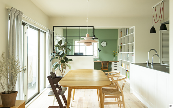 主役となるキッチンは、框組の扉でクラシックな雰囲気を醸し出し、そこにハンギングツールなどを多用することでインダストリアルな要素が加わり、ダイニングキッチン隣接のワークスペースにはグリーンの壁や格子窓、収納扉にはルーバーなど、全体のバランスを見ながらインテリアのアクセントをつけてリノベーションをしました。