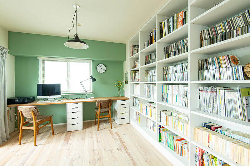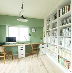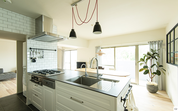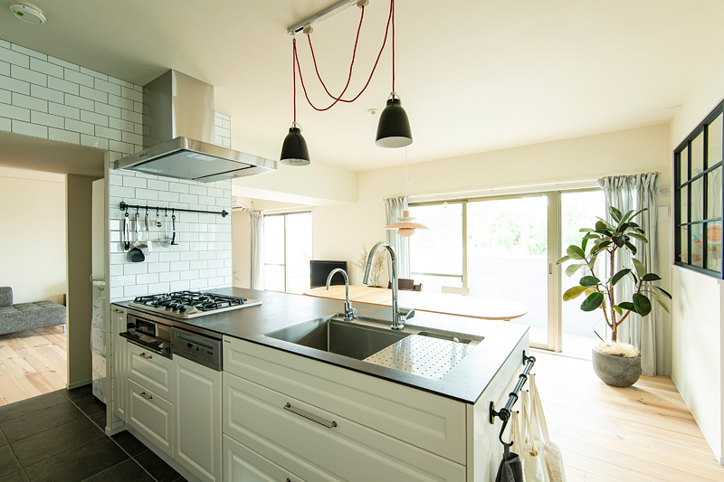 主役となるキッチンは、框組の扉でクラシックな雰囲気を醸し出し、そこにハンギングツールなどを多用することでインダストリアルな要素が加わり、ダイニングキッチン隣接のワークスペースにはグリーンの壁や格子窓、収納扉にはルーバーなど、全体のバランスを見ながらインテリアのアクセントをつけてリノベーションをしました。